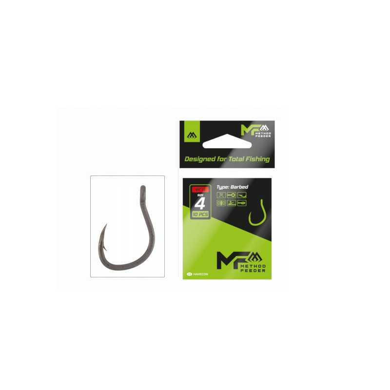 Haczyki Mikado MF14 z zadziorem - nowe pogrubione haki zaprojektowane z myślą o dużych rybach łowionych metodą, bombką lub pellet wagglerem. Charakteryzują się agresywnym kształtem, wytrzymałością oraz pewnym trzymaniem zaciętej ryby. Wykończone matowym kolorem i zadziorem.