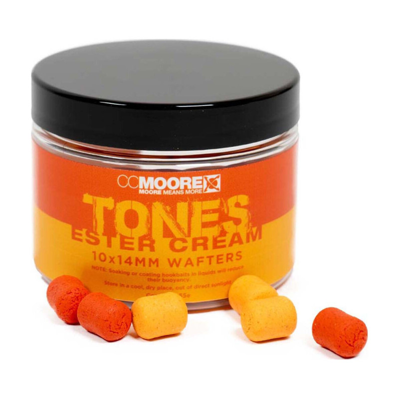 Tones Wafters od CC Moore dają możliwość subtelnej zmiany koloru przynęty haczykowej w zależności od poziomu nasłonecznienia zbiornika wodnego. Każdy słoiczek zawiera wyprane pomarańczowe i ciemnopomarańczowe waftersy wykonane ze słynnej mieszanki smakowej Ester Cream. Dostępne w standardowych rozmiarach 14x10mm, są bardzo skuteczne przez cały rok i mogą być używane na zestawach z workami PVA lub samodzielnie. Testy nad wodą pokazały skuteczność tej przynęty!