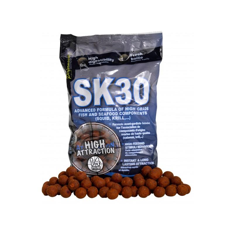 Kulki proteinowe Starbaits PC SK30 - Stworzone z wysokiej jakości surowców mięsnych uznanych za swoje atrakcyjne zasady, takie jak: mączka rybna suszona w niskiej temperaturze, rozpuszczalne ekstrakty białek rybnych, ekstrakty morskie i powiązane z rozpuszczalnymi atraktantami z kałamarnicy i kryla, „SK 30” ma profil aminokwasowy, a także profil kwasów tłuszczowych pozwalający zaliczyć ją jako niezbędną przynętę przy selekcji dużych ryb. Wzmocnione naturalnymi olejami uznawanymi za pobudzające również zmysły węchowe i smakowe. Przynęta łatwo strawna szybko przyzwyczaja, a nawet uzależnienia ryby podczas długotrwałego nęcenia bez zjawiska nasycenia!