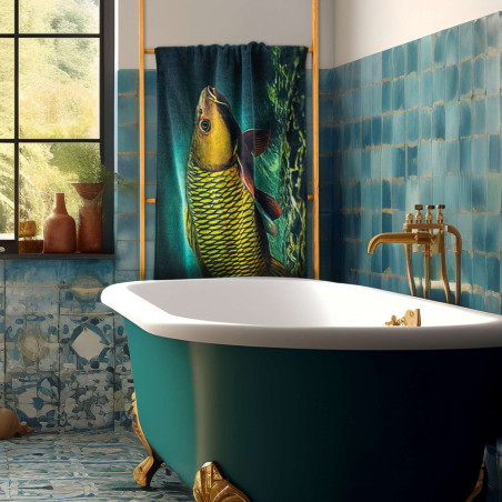 Kolekcja ręczników dla miłośników natury to wyjątkowe wzory inspirowane światem zwierząt i pięknem przyrody. Ręcznik zachwyca realistycznym nadrukiem w głębokich odcieniach zieleni, złota i czerni, które oddają charakter tej popularnej ryby. To ręcznik, który od razu przyciąga wzrok i doskonale sprawdzi się nie tylko w łazience, ale też podczas wypadów nad wodę.